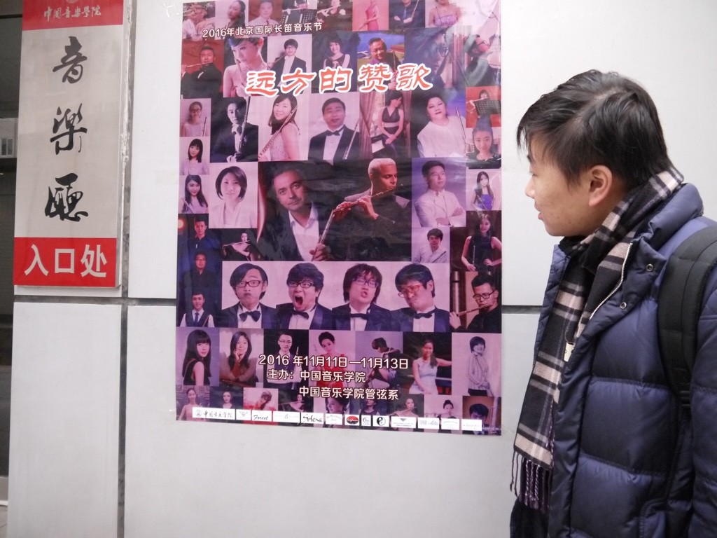 会場は中国音楽院。ポスターを発見。写真に写っているのは今回案内をして下さっている陳さん。