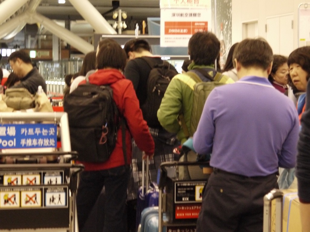 搭乗手続き。40分ほど並びました。写真は先に並んでる江戸と森本。