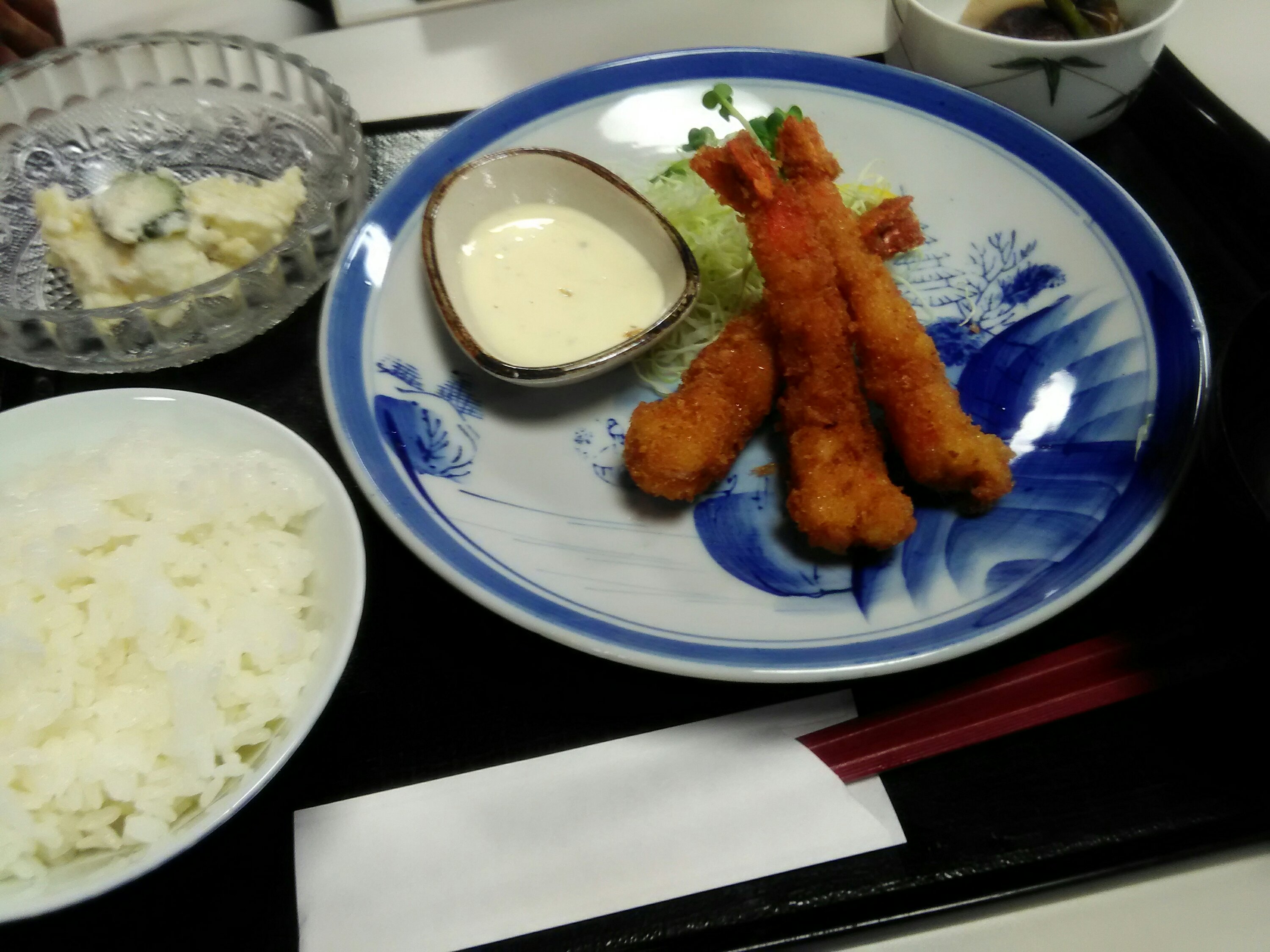 昼食は何を食べようか悩んだ末に、エビフライ定食を食べたよ。