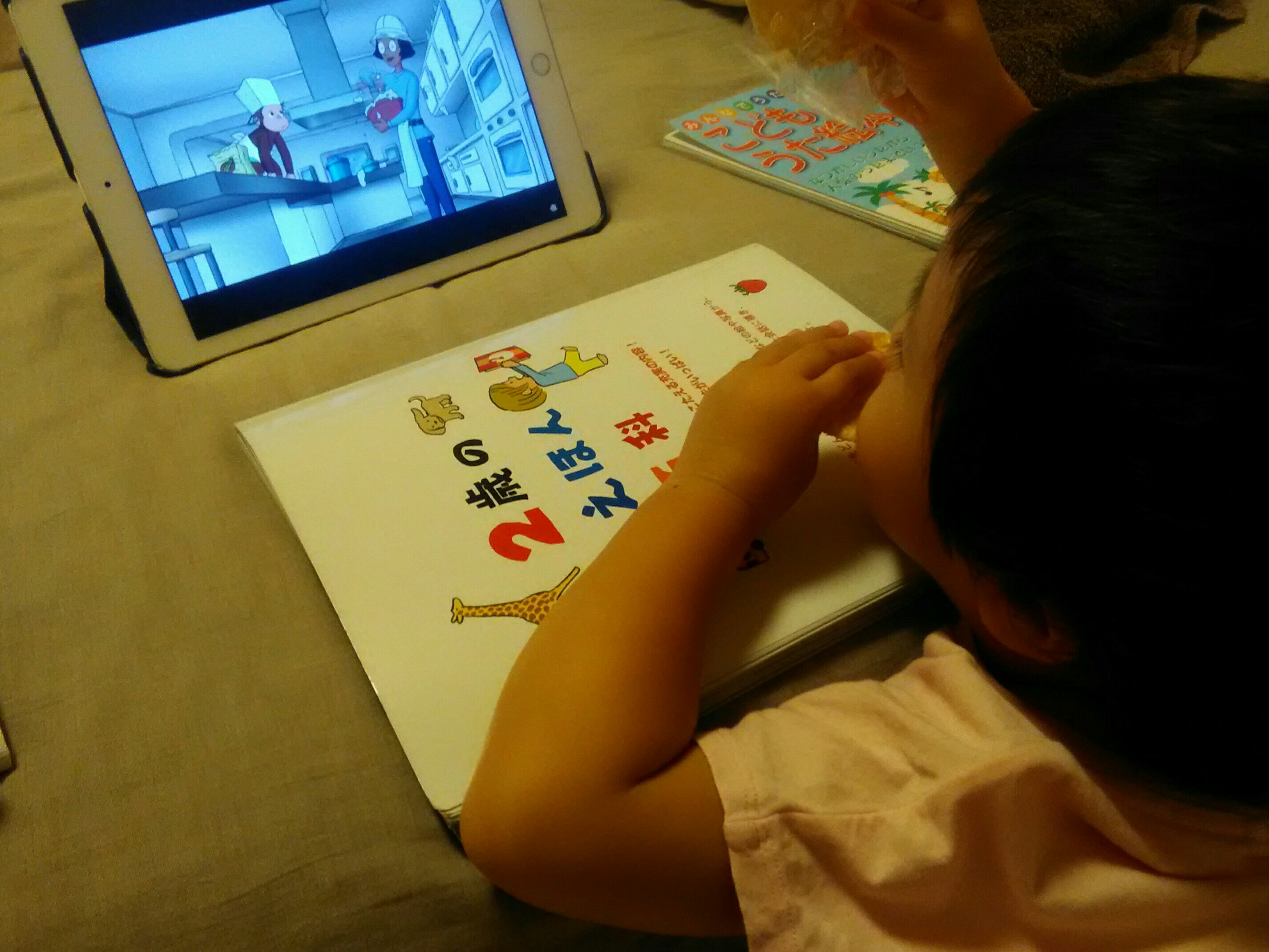 また、断続的に停電があり、エアコンが切れて暑かったのか、ほどなく娘は起きてきました。寝室はほかの部屋より窓が少なく安全なので、娘はしばらく寝室で待機する事にしました。リラックス出来るようにipadでおさるのジョージをみせています。