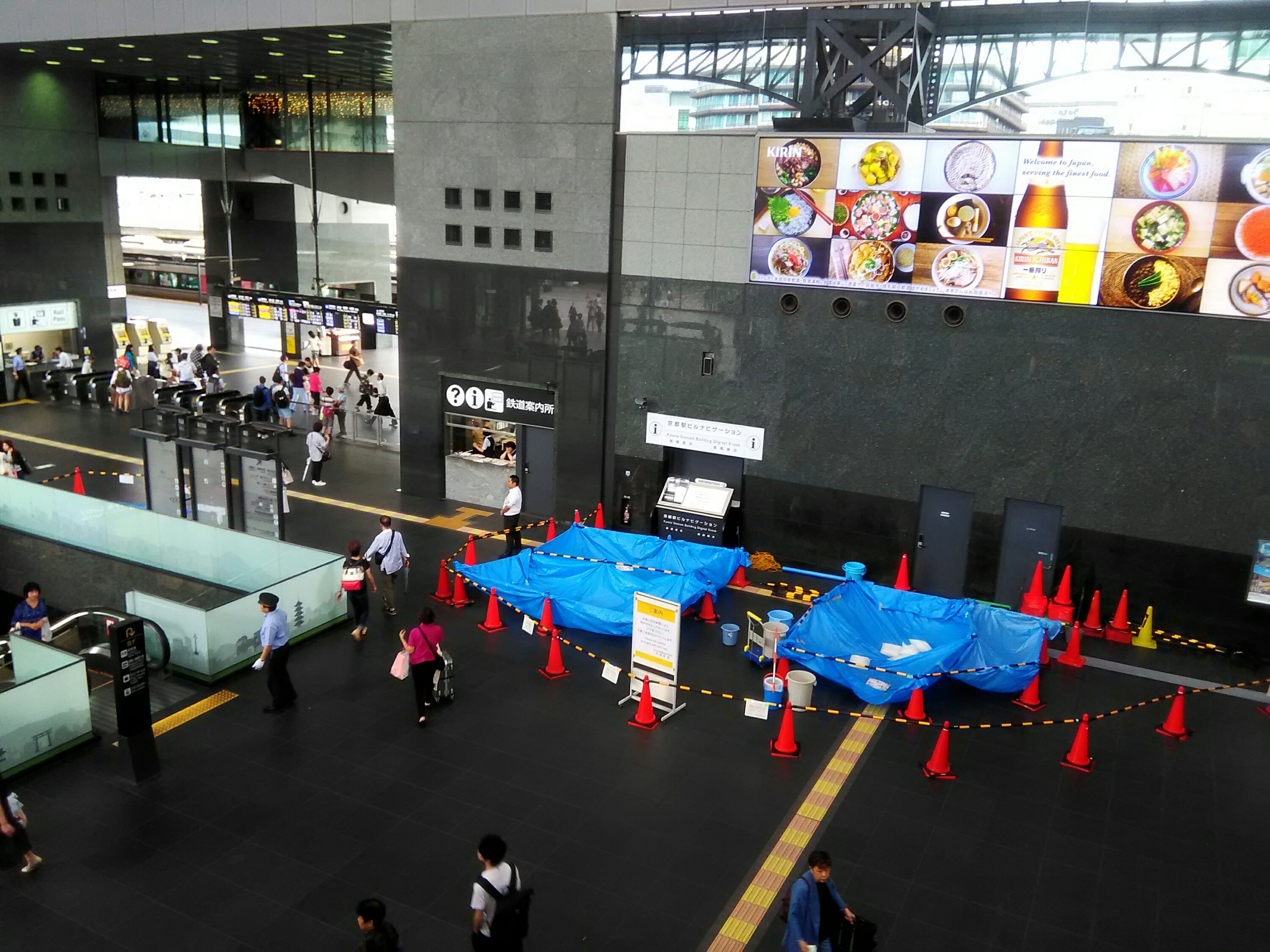 京都駅の屋根が落ちた場所は、雨漏りの影響のためブルーシートが敷いてありました。