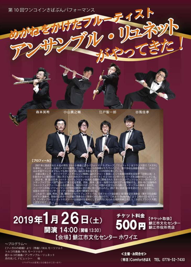 音楽全員、めがねをかけたフルーティストのユニット「アンサンブル・リュネット」の公演。めがねを愛し、眼鏡の産地・鯖江市を「聖地」と呼び愛着を持つ彼らのフルートが織りなす豊かな音楽をお届けします。