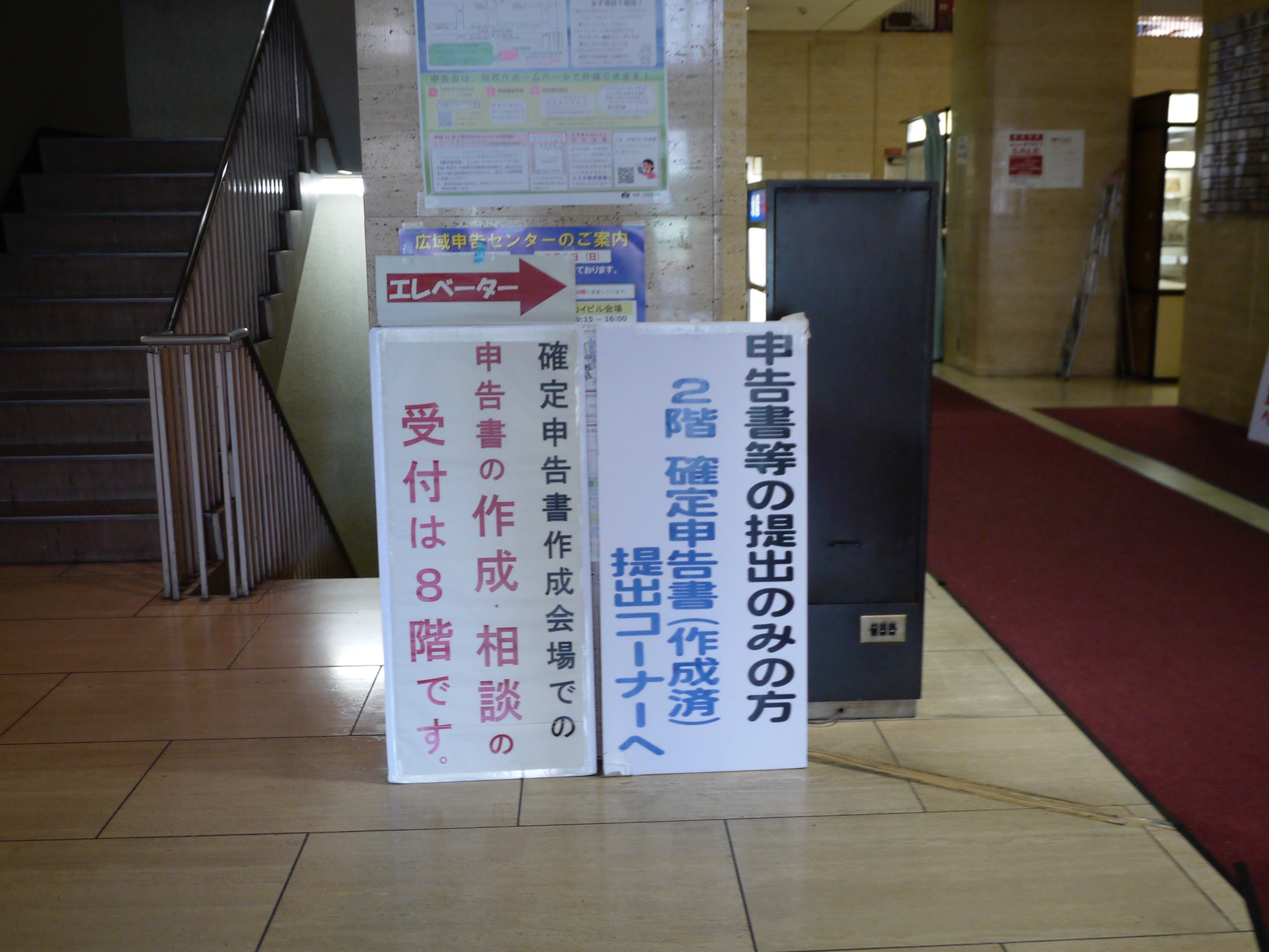 中に入ると、申告書等の提出のみの方2階確定申告書提出コーナーへ、申告書の作成・相談の受付は8階です。という看板があります。僕は申告書は作成済みで、提出だけなので2階へ上がります。