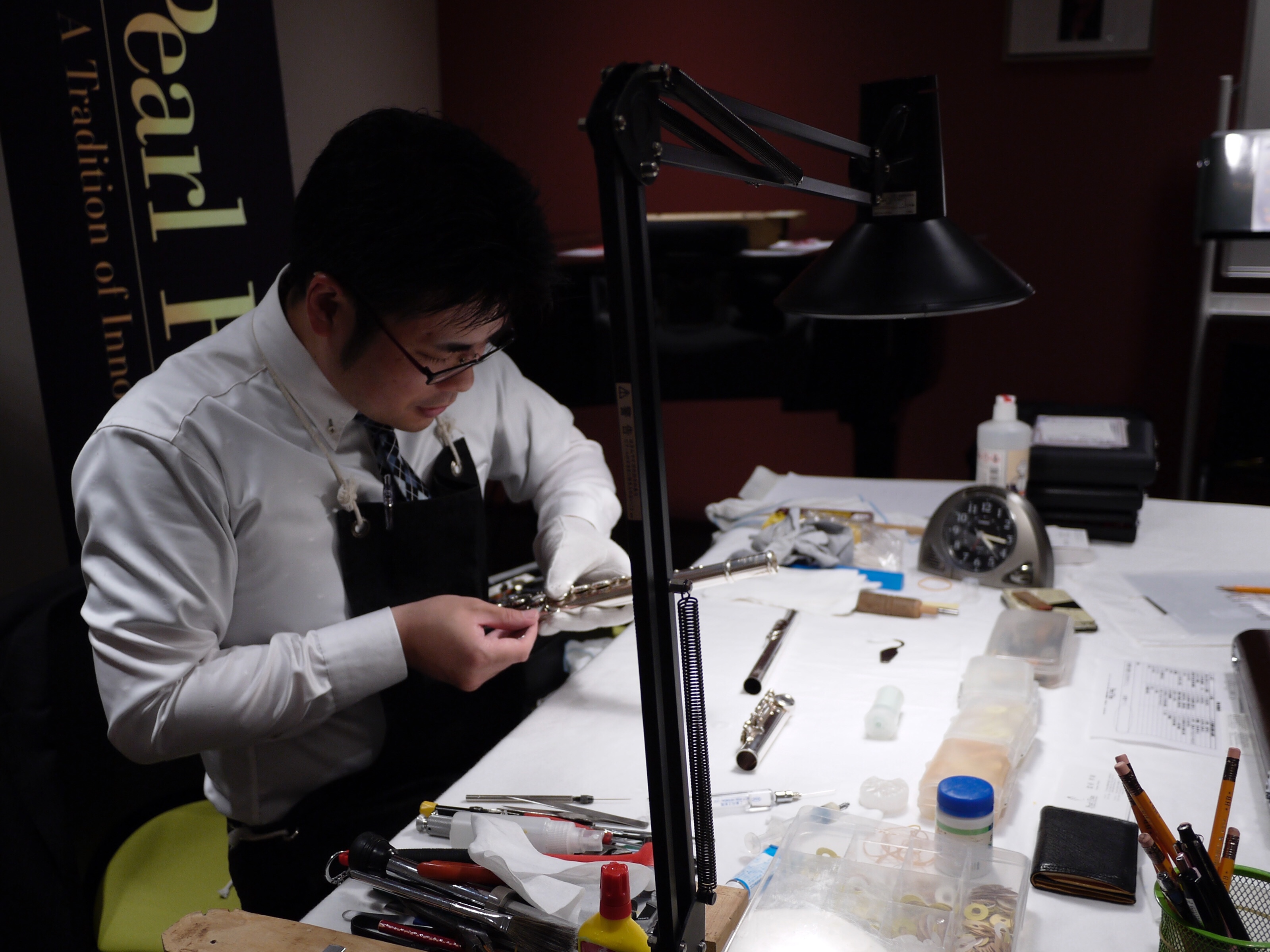 パールフルートの工場長、當房さんにフルートを調整してもらっているところ。ありがとうございます。